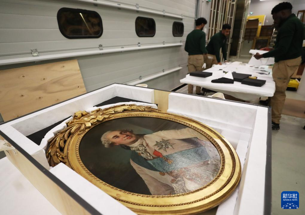 3月11日,在法国巴黎近郊的凡尔赛宫,工作人员打包油画《路易十六半身肖像》。