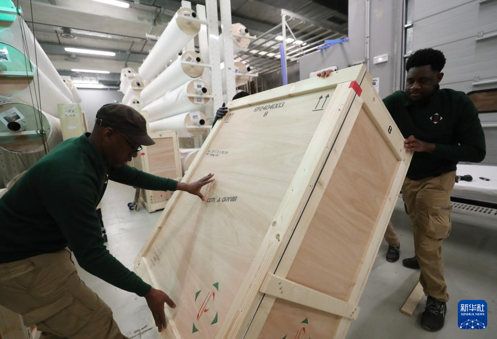 3月11日,在法国巴黎近郊的凡尔赛宫,工作人员在展品打包现场忙碌。