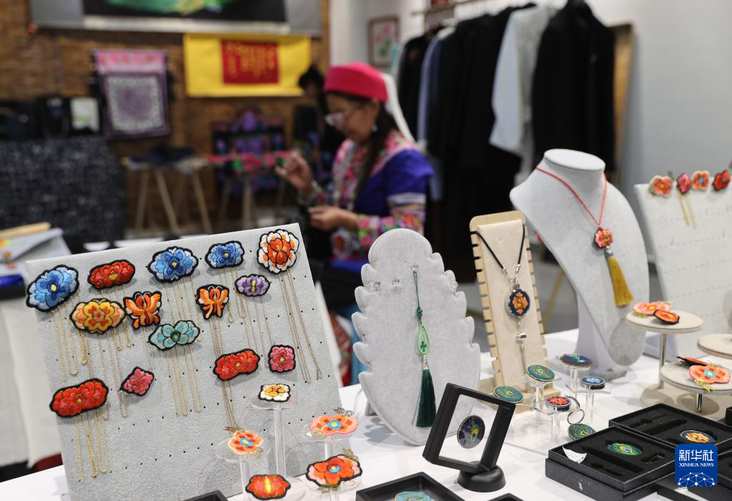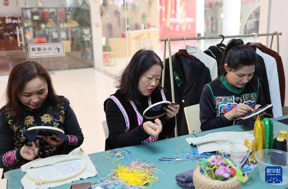 3月13日,在云南省双柏县特色产业一条街,“绣娘”在店内制作绣品。