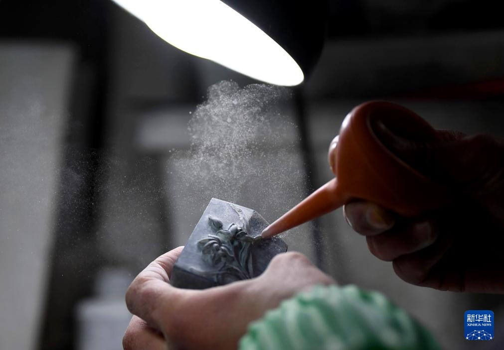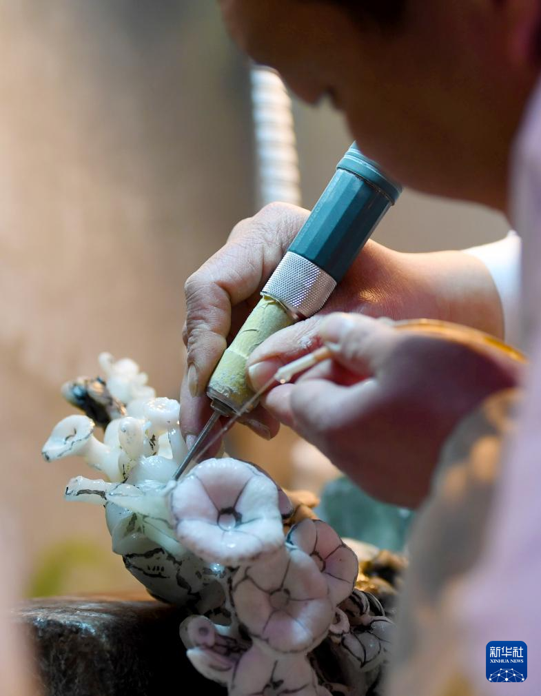 3月12日,河南省南阳市镇平县玉雕大师创意园一家工作室内,一名玉雕工作者在雕刻玉器。