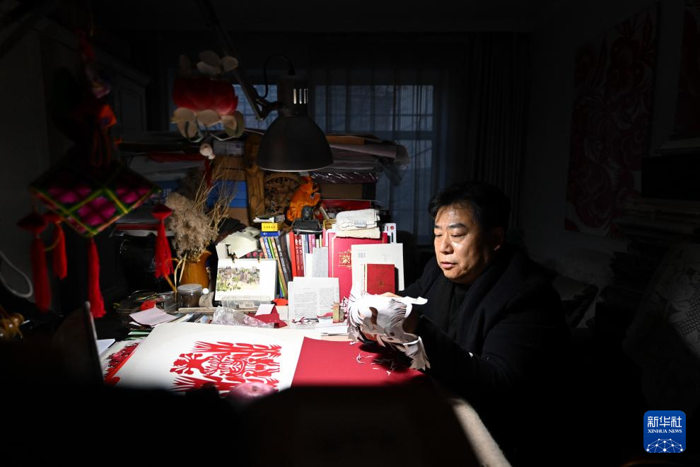 段建珺在和林格尔剪纸传习所内创作剪纸(3月14日摄)。