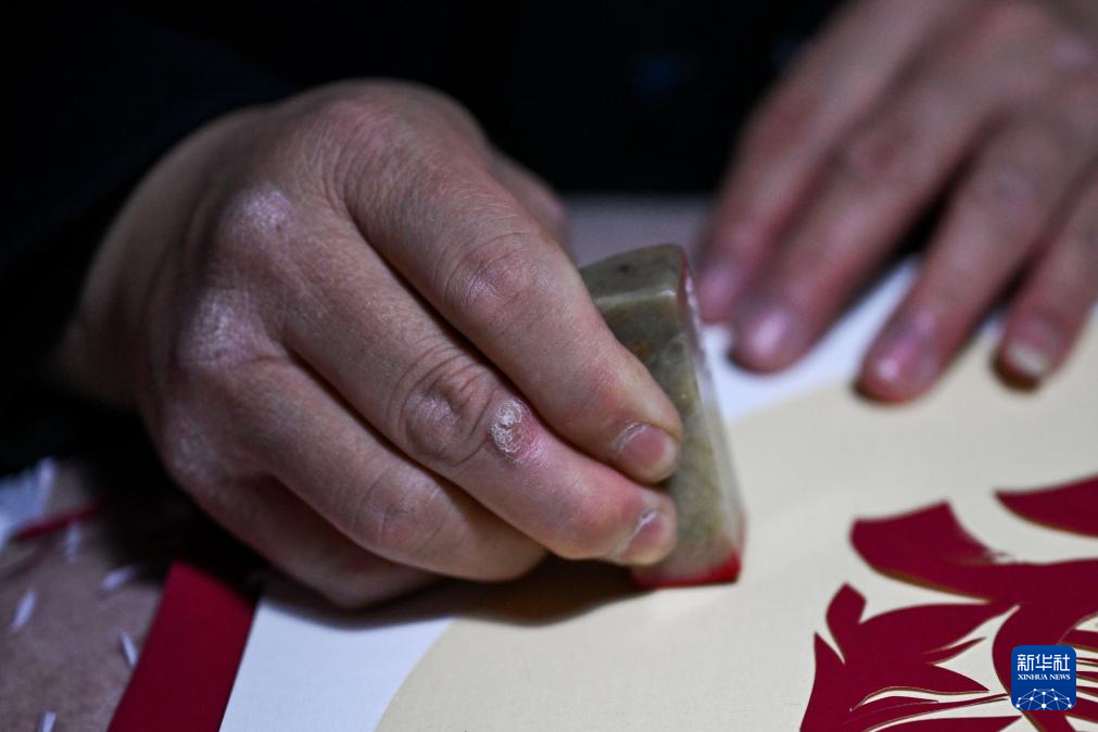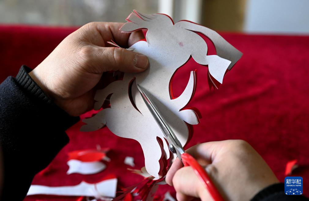 3月14日,段建珺在位于内蒙古呼和浩特市和林格尔县的家中创作剪纸作品。
