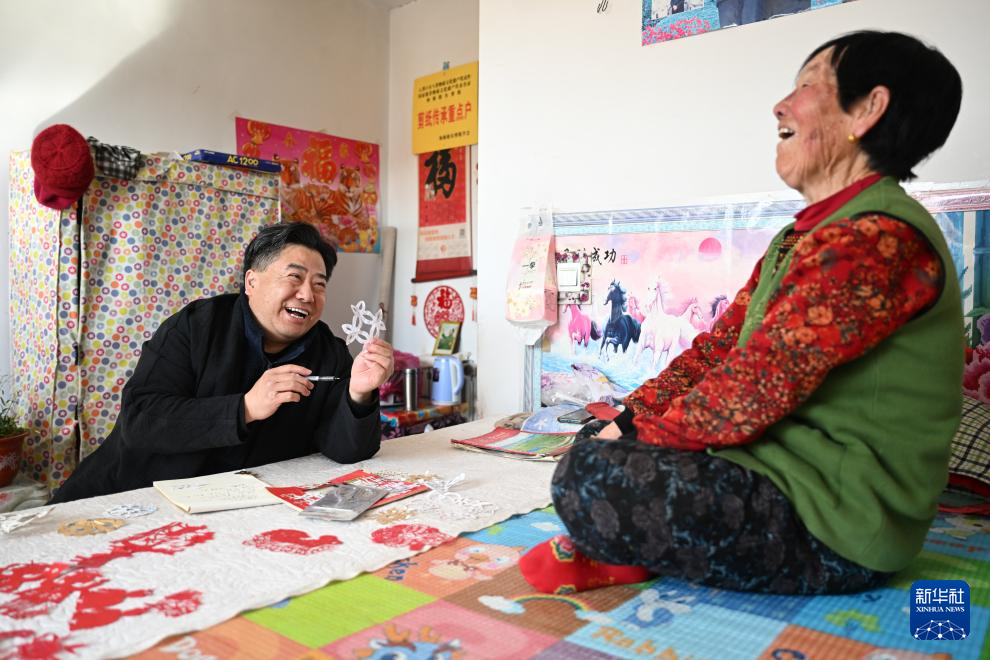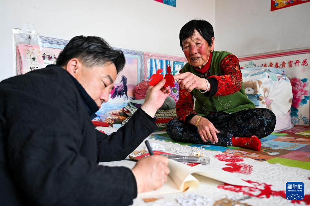段建珺(左)在内蒙古呼和浩特市和林格尔县羊群沟乡幸福院内与当地老人梁巧连交流传统剪纸图样(3月15日摄)。