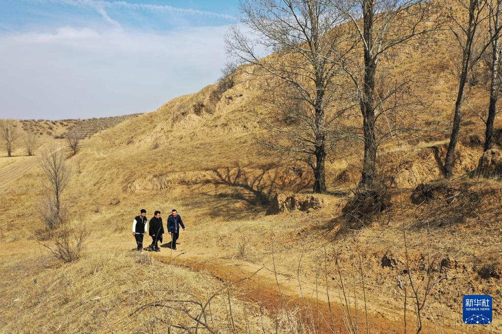 3月15日,段建珺(中)走在和林格尔县羊群沟乡的乡村道路上(无人机照片)。