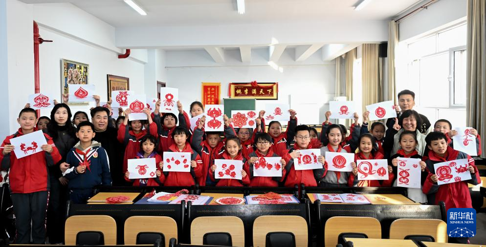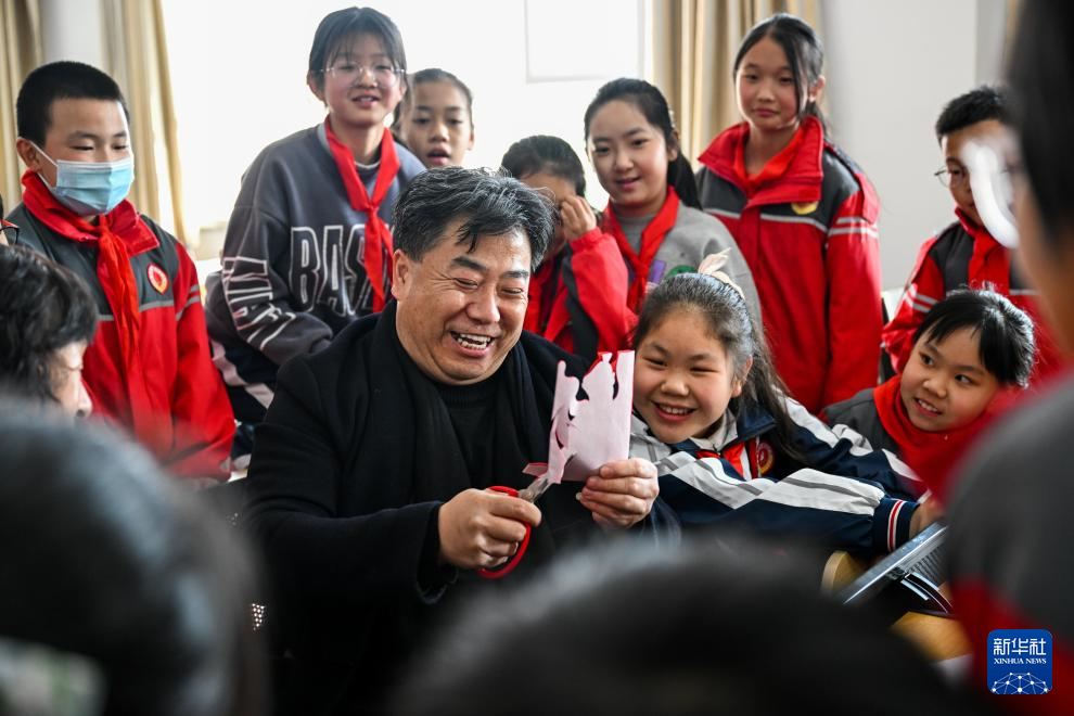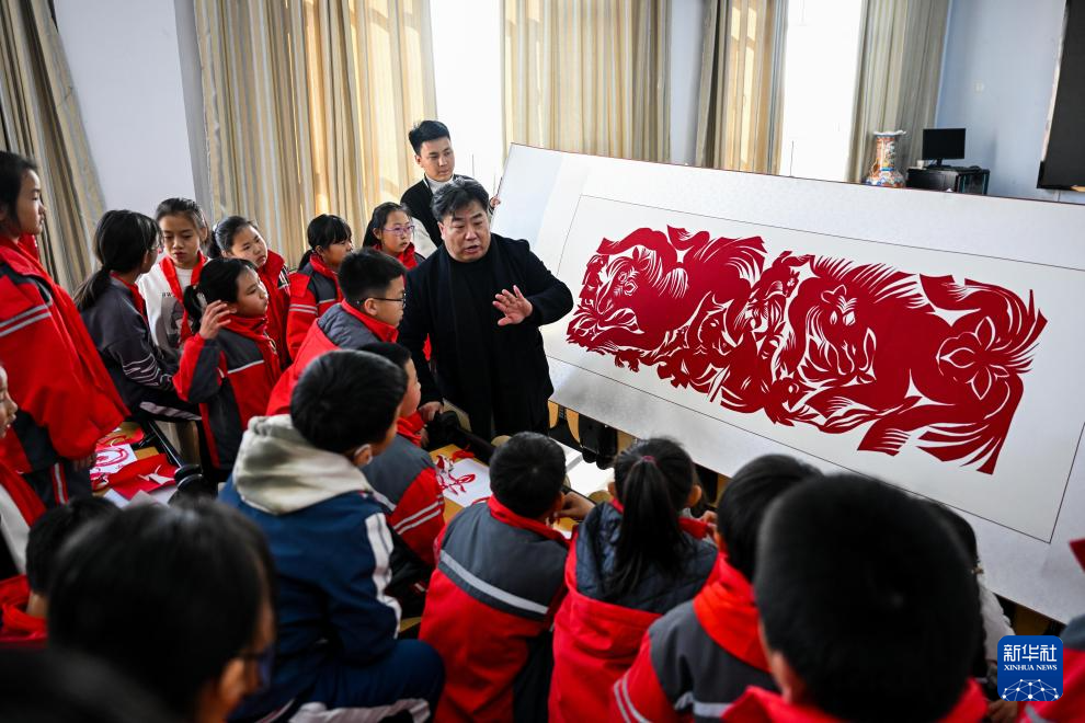 3月14日,段建珺(中)在和林格尔县第二小学向小学生讲解剪纸技艺。