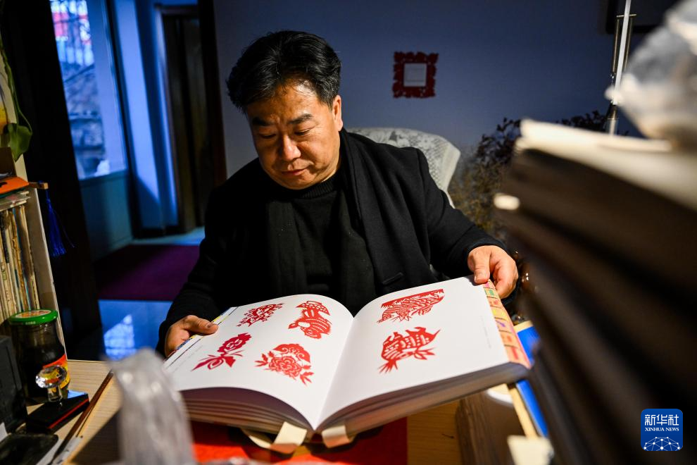 3月14日,段建珺在家中翻阅剪纸书籍。