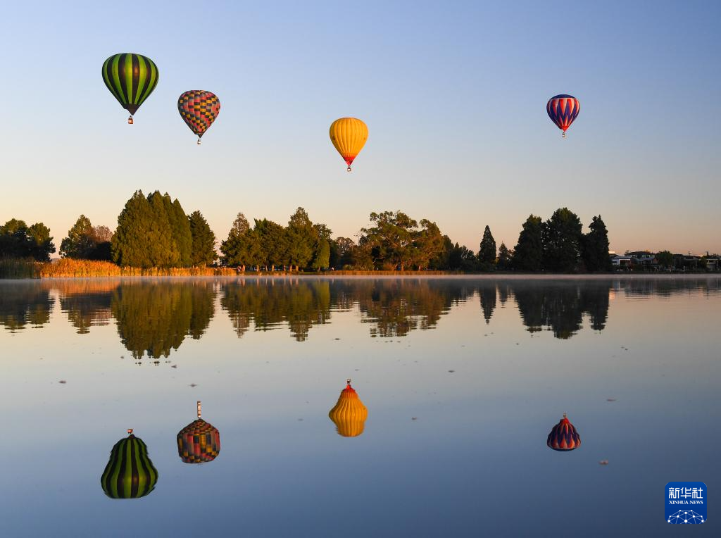 3月20日清晨,放飞的热气球经过新西兰汉密尔顿湖上空。