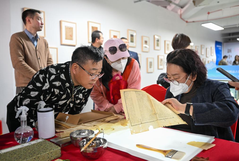 3月31日,在天津棉3创意街区,市民在海河旧书市集活动上了解古籍修复。