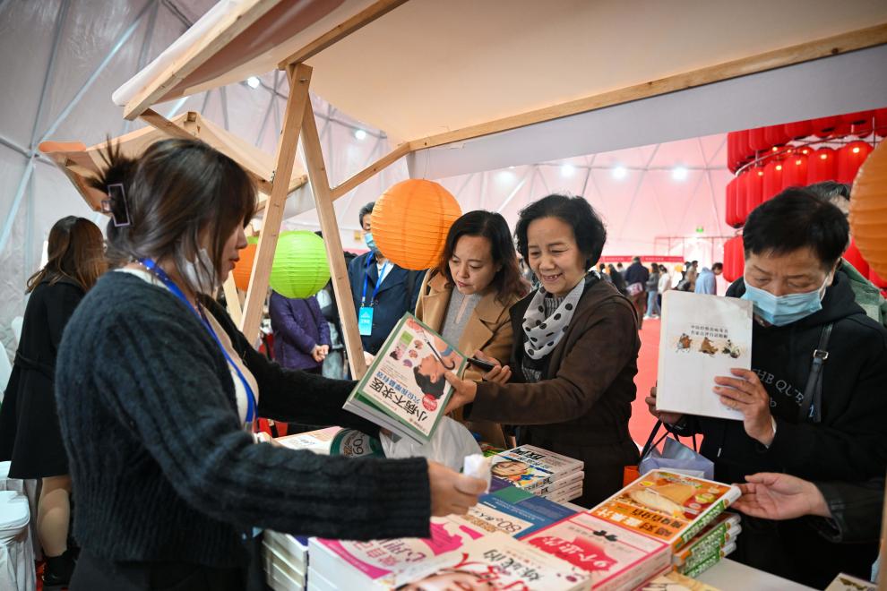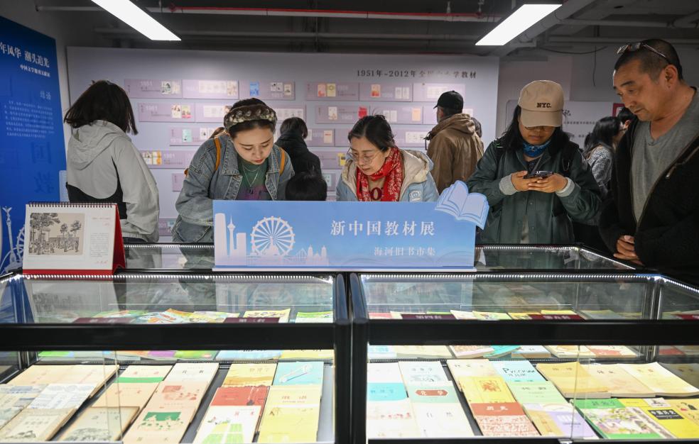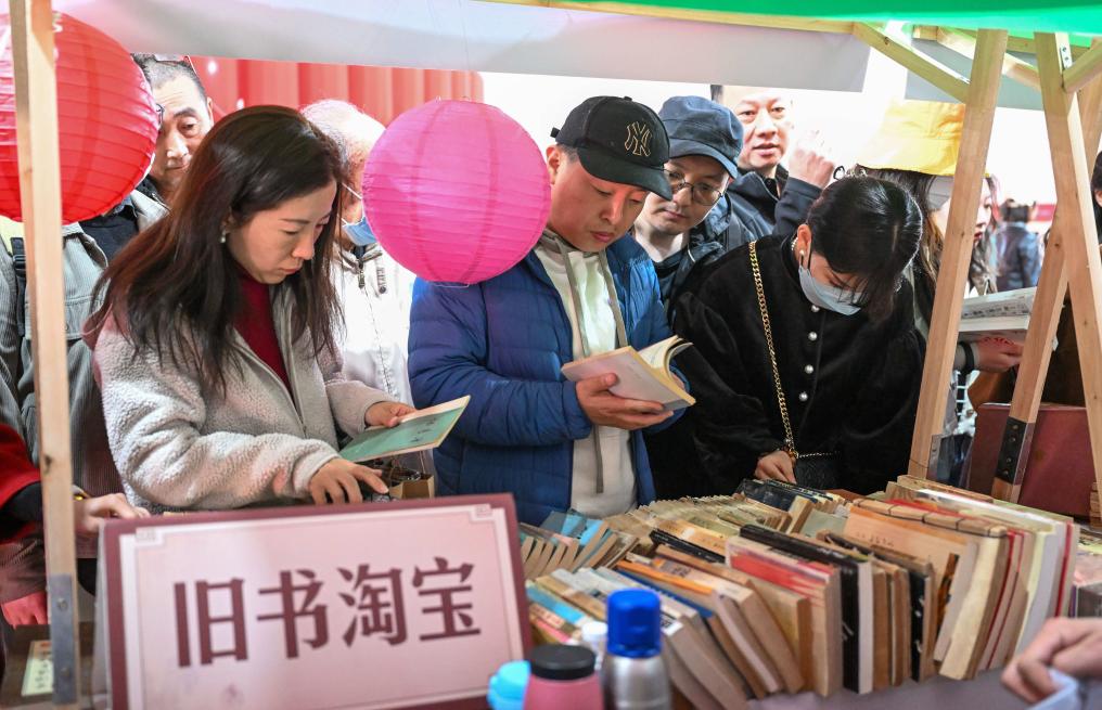 3月31日,在天津棉3创意街区,市民在海河旧书市集活动上挑选书籍。