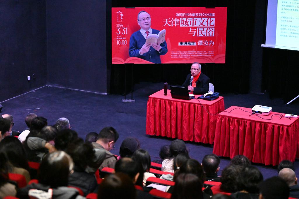 3月31日,天津师范大学教授谭汝(右)在天津棉3创意街区内办讲座。