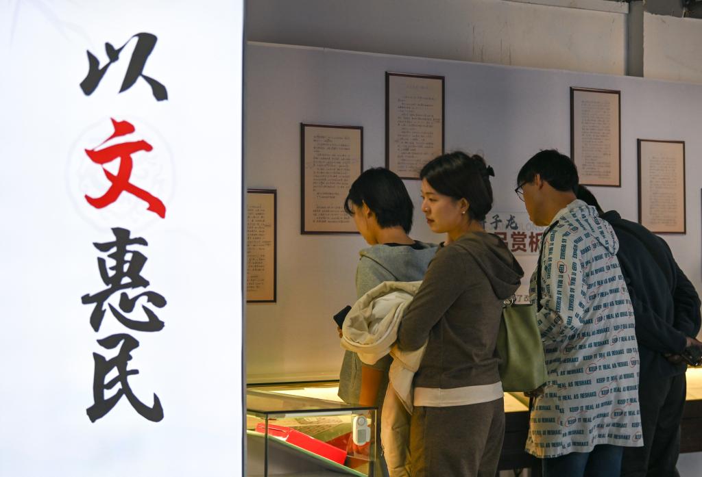 3月31日,在天津棉3创意街区,市民在参观文学藏品展。