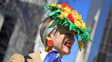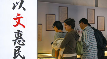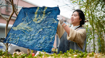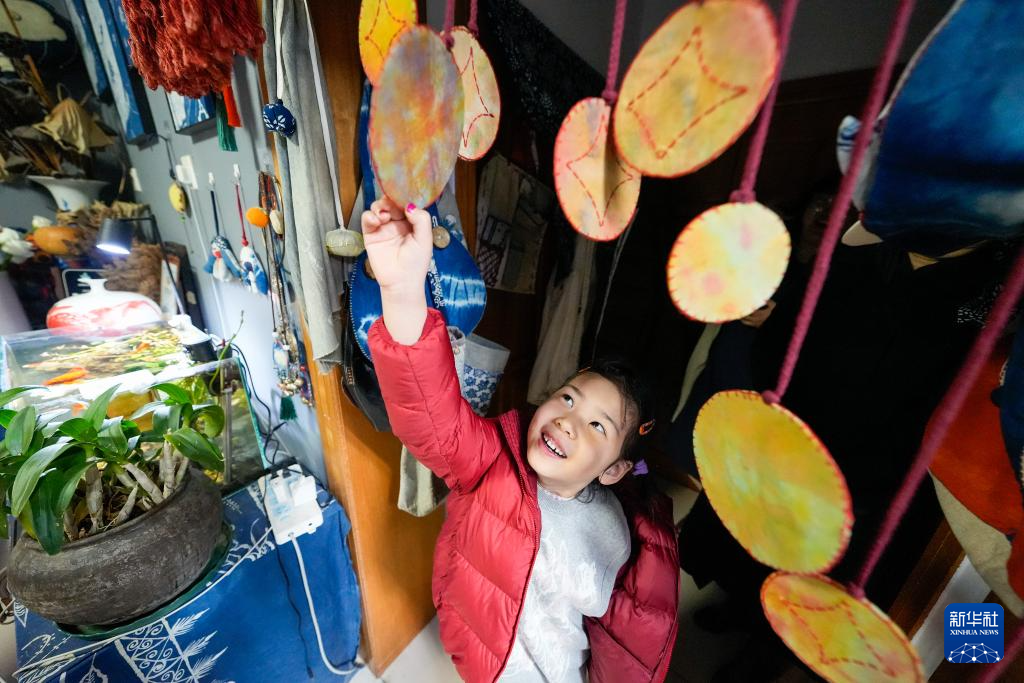 4月6日,一名小学员在李萨的工作室内参观蜡染产品。