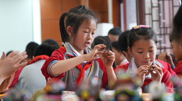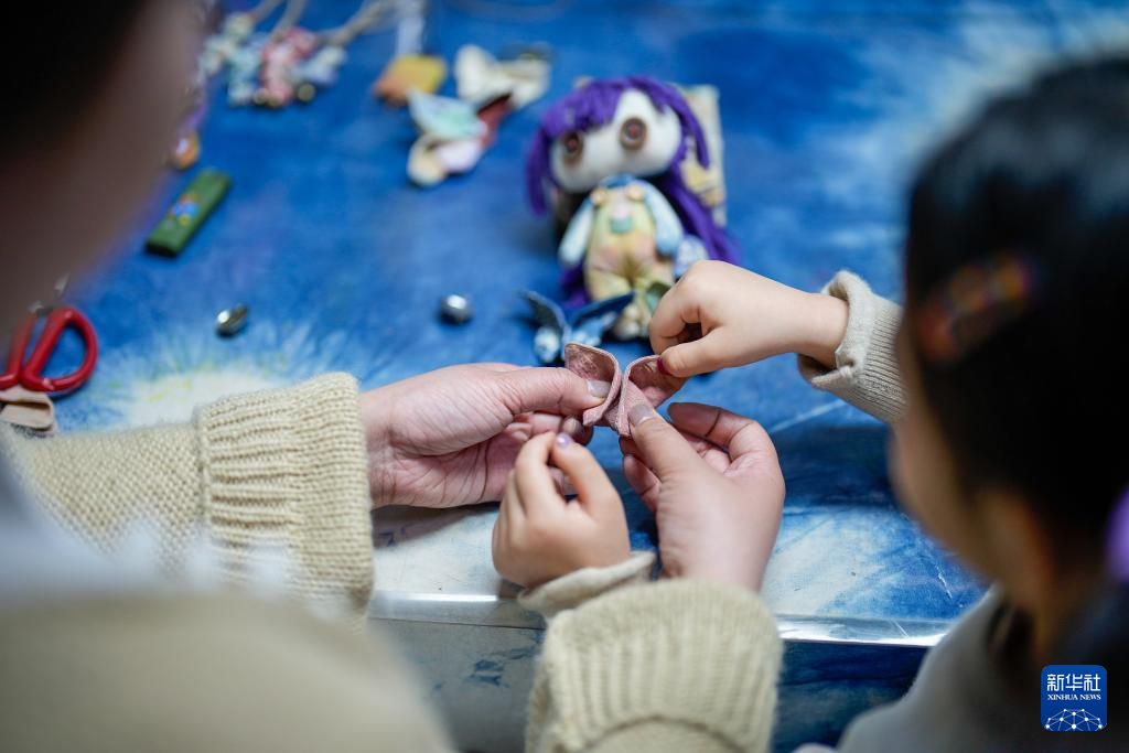 4月6日,李萨在工作室内教授小学员蜡染工艺品制作技艺。