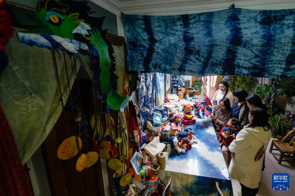 4月6日,李萨(左一)和母亲甘彩云(左二)在工作室内为参观者讲解蜡染制作技艺。