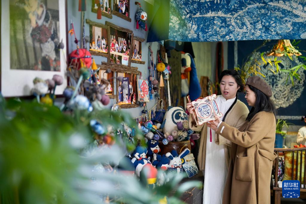 4月6日,李萨(左)在工作室内为顾客介绍蜡染工艺品。