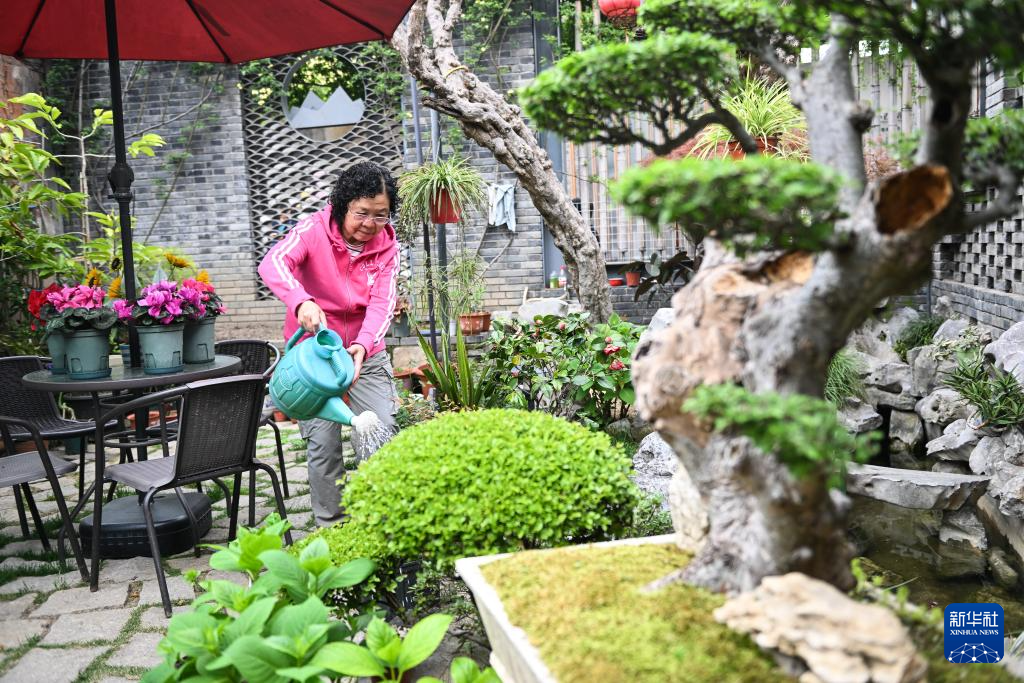 在小西湖街区一处“共享院”,老居民秦阿姨给花木浇水(4月1日摄)。