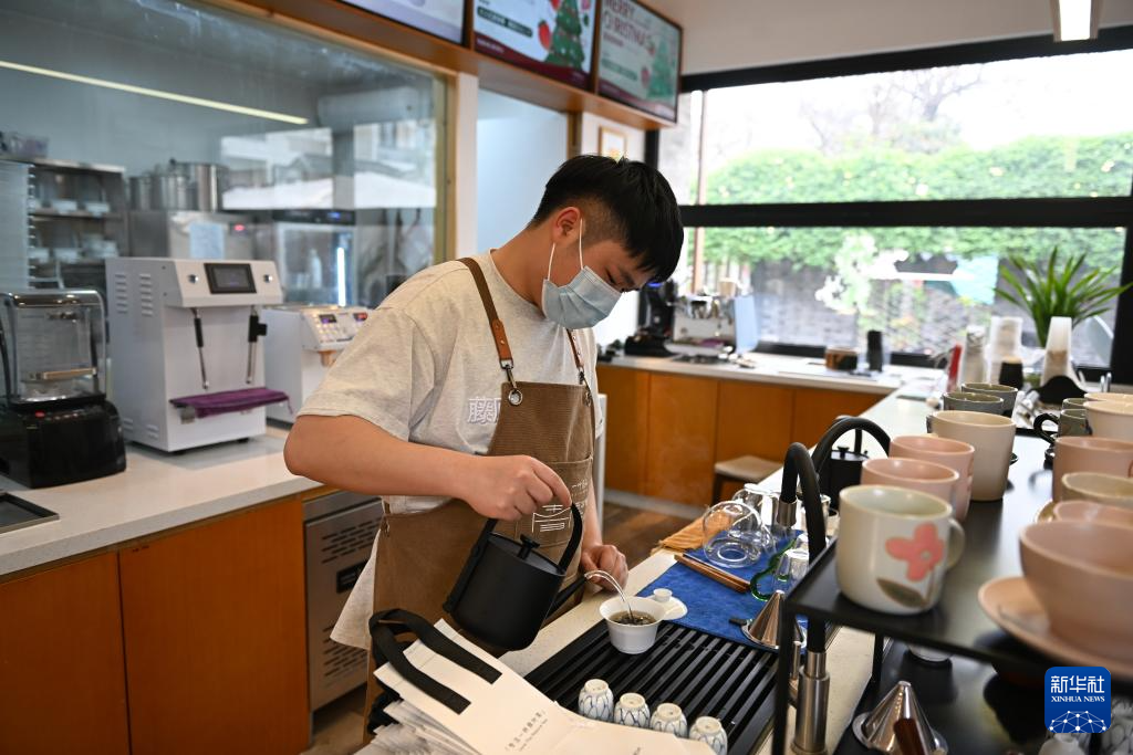小西湖街区一家店铺的员工在泡茶(4月1日摄)。