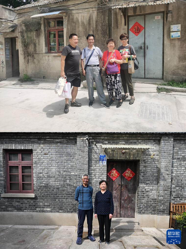 拼版照片:上图为2020年,小西湖街区居民张德恕(左二)和老伴冯秀兰及女儿、女婿在旧房前留影(资料照片);下图为张德恕和老伴冯秀兰在改造后的房屋前留影(4月1日摄,新华社记者 季春鹏 摄)。