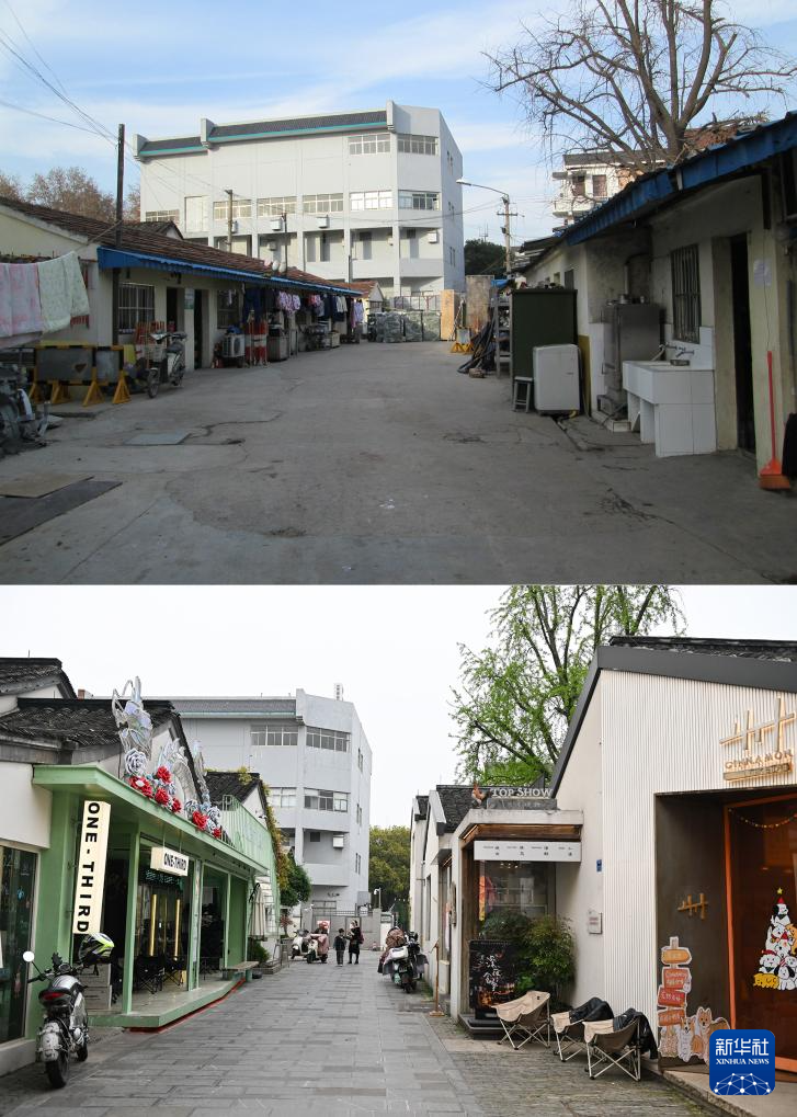 拼版照片:上图为小西湖街区堆草巷改造前的民居(资料照片);下图为改造后的小西湖街区堆草巷(4月1日摄,新华社记者 季春鹏 摄)。过去的民居已成为“共生院”。“共生院”是利用院落内居民搬迁的房屋释放部分空间,增加功能性设施,改善留住居民的生活居住条件,同时植入新业态,形成和谐共处的共生院落。