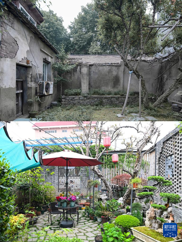 拼版照片:上图为小西湖街区一处改造前的院落(资料照片);下图为改造后的该民房(4月1日摄,新华社记者 季春鹏 摄)。如今,民房已成为“共享院”。“共享院”是在保留居民原有居住功能及院落形态的前提下,居民参与合作建设,进行功能混合及敞开公共空间设计,让原本封闭的院落成为交流空间。