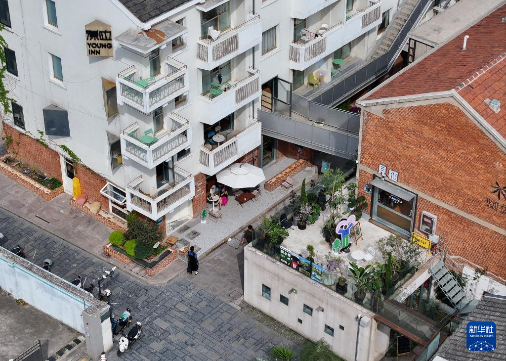 工人在对小西湖街区一处房屋进行改造(4月1日摄,无人机照片)。
