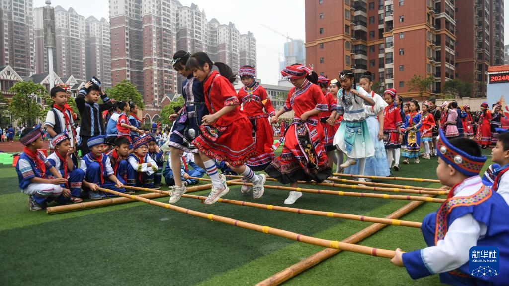 在柳州市柳江区进德镇中心幼儿园,老师和小朋友们在庆祝“三月三”活动中体验民俗活动(4月9日摄)。