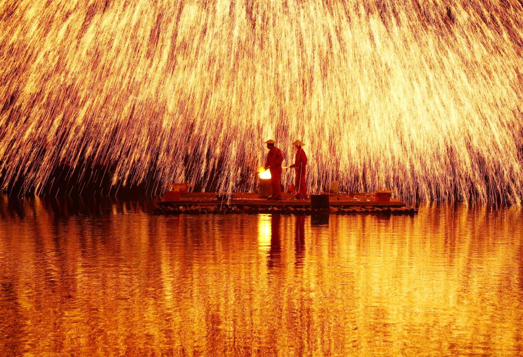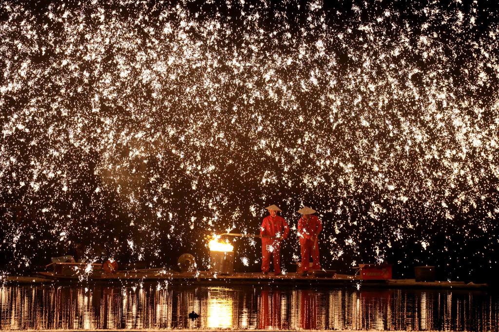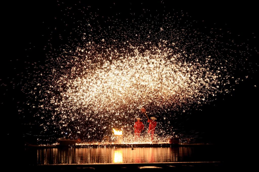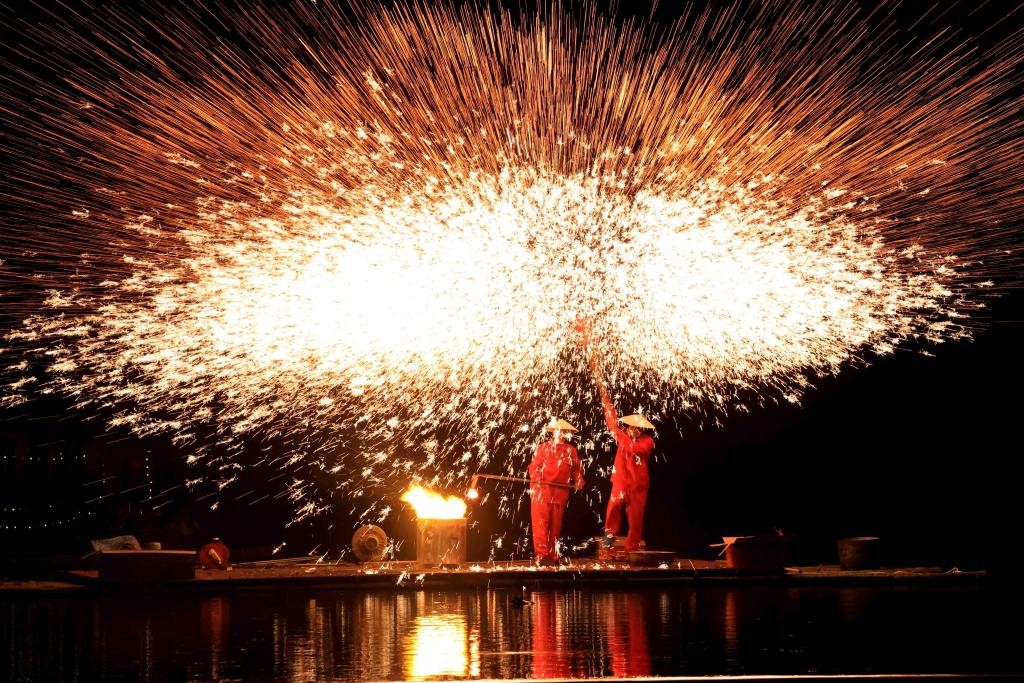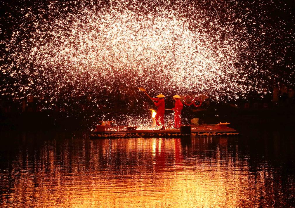 2024年4月8日,广西壮族自治区柳州市融安县雅瑶乡,民间艺人在表演打铁花。CICPHOTO/谭克兴 摄