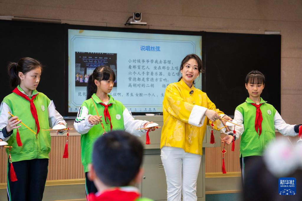 4月12日,在武陵区北正街小学,老师在介绍常德丝弦。