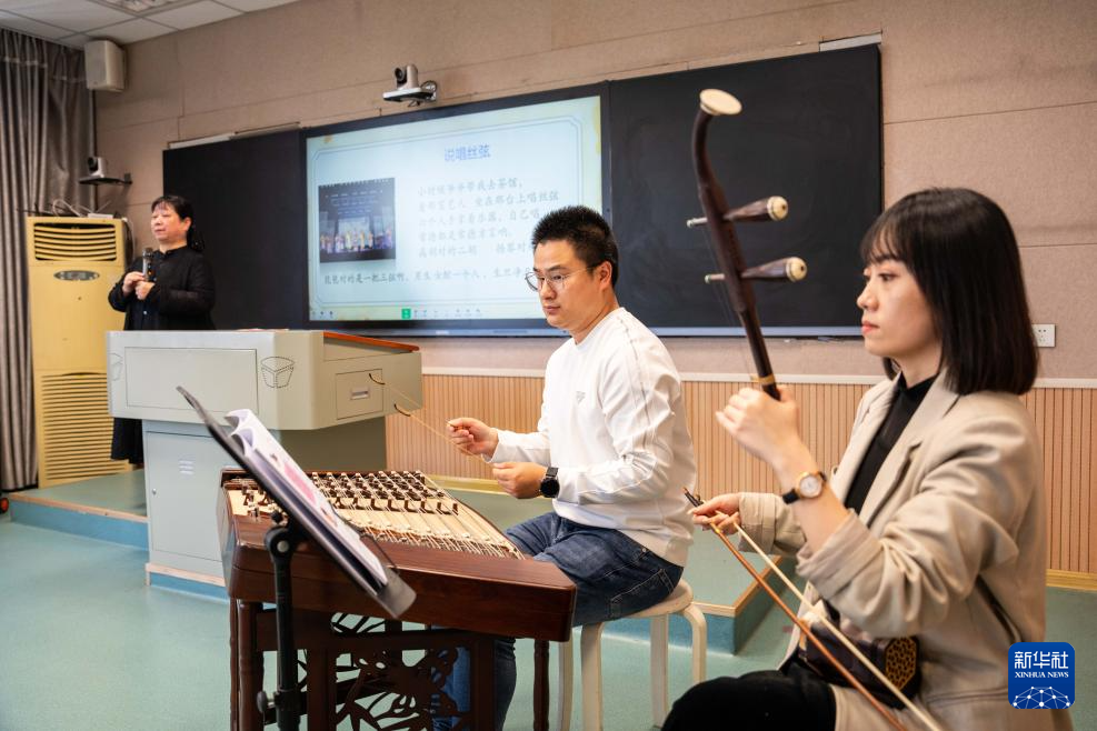 4月12日,在武陵区北正街小学,武陵区文化馆工作人员在演奏常德丝弦配乐。
