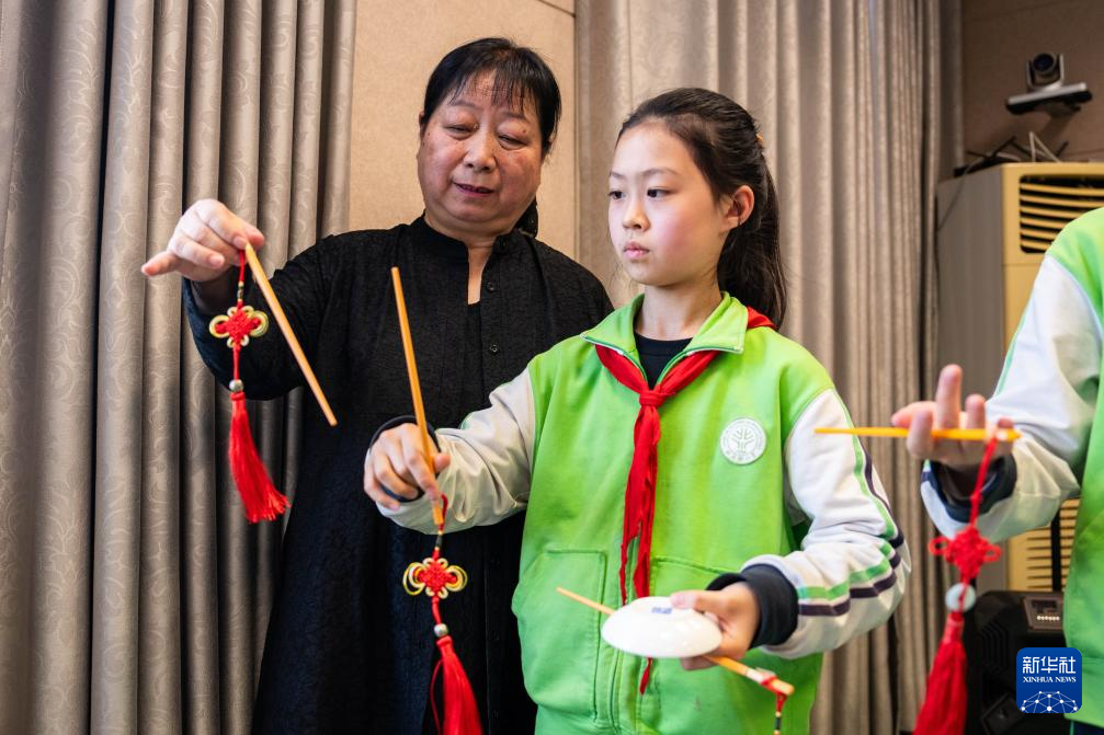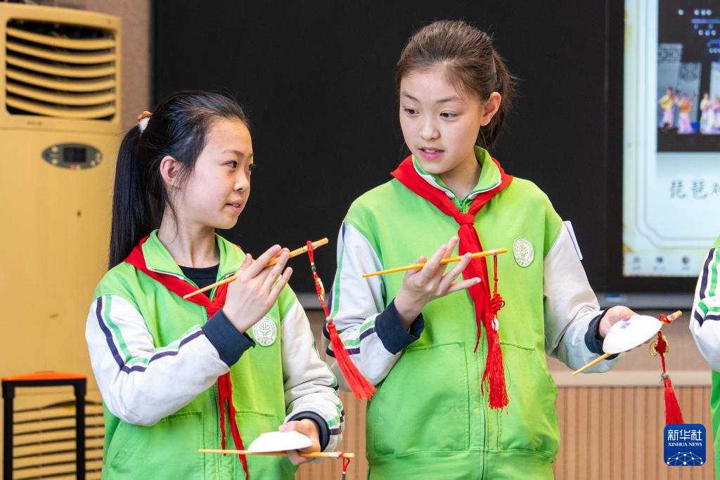 4月12日,在武陵区北正街小学,学生在练习常德丝弦的打碟技艺。