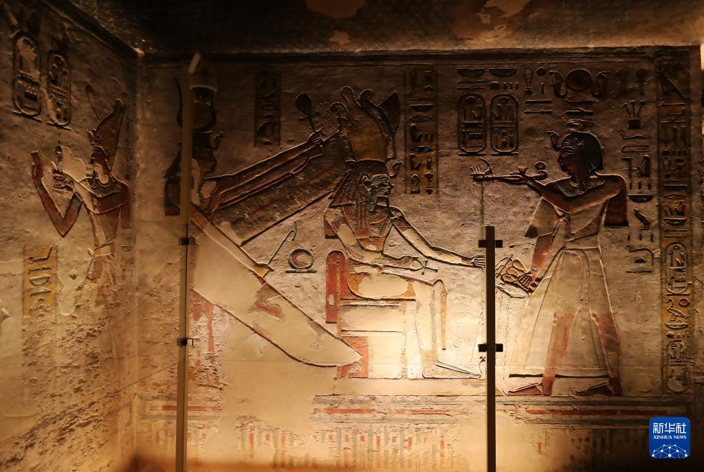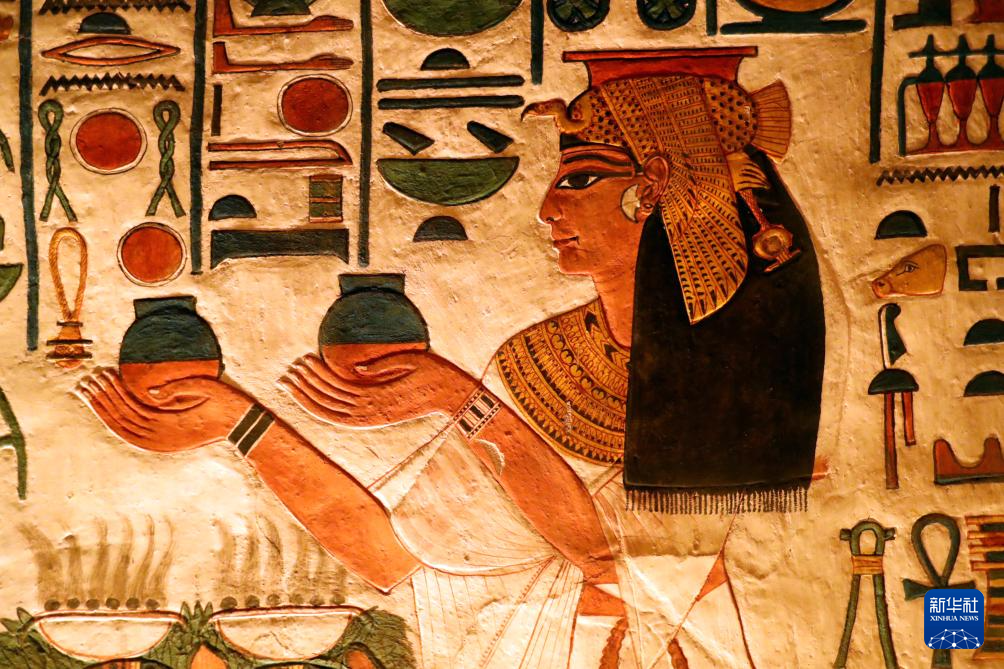 这是2023年1月24日在埃及卢克索王后谷拍摄的奈菲尔塔利地下陵墓壁画。