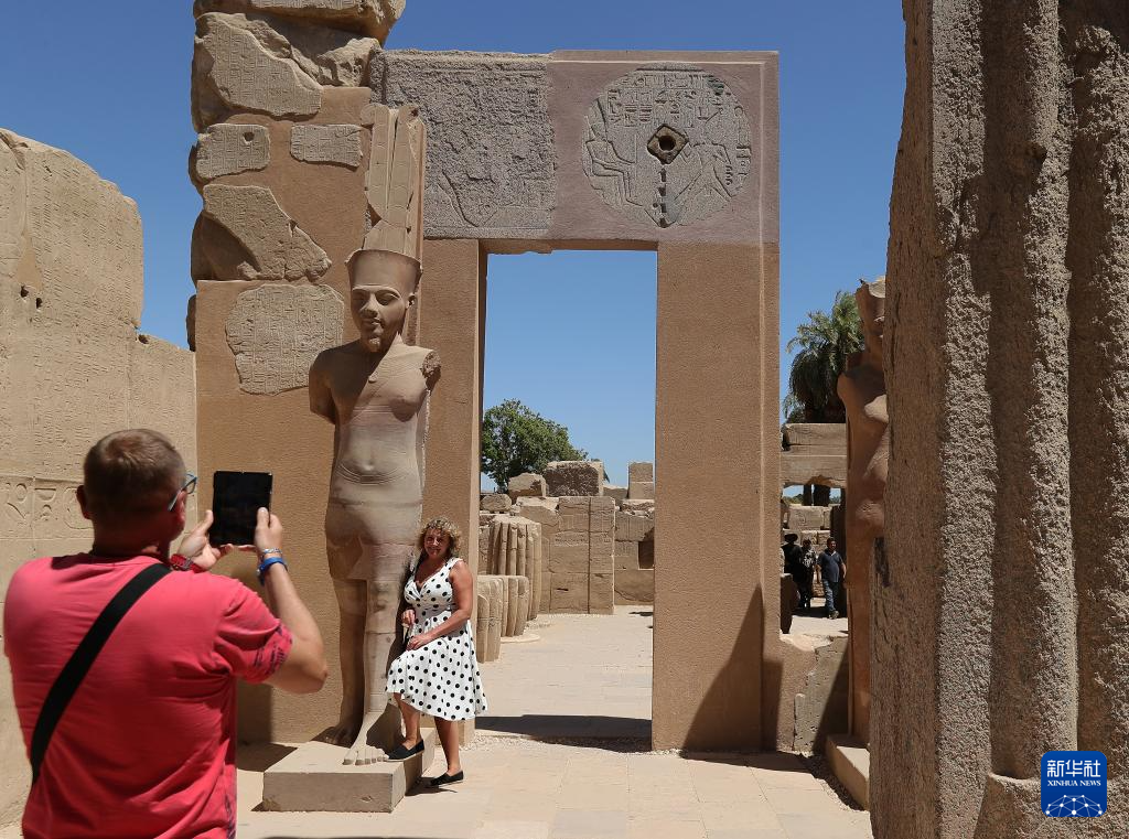 2024年4月8日,游客在埃及卢克索的卡尔纳克神庙拍照。