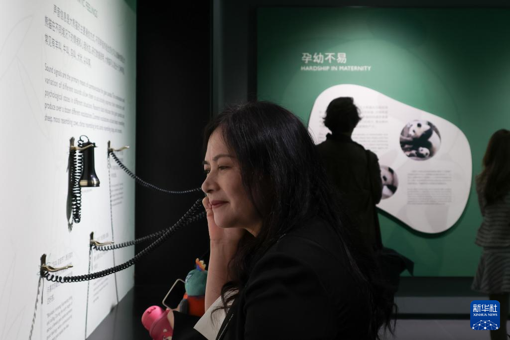 4月22日,在大熊猫国际文化交流中心,参观者体验互动装置,听大熊猫不同状态下发出的声音。