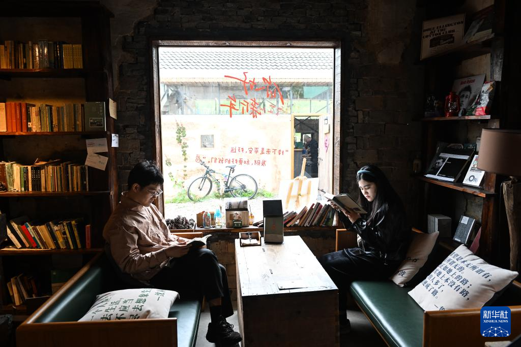 4月21日,来自杭州的游客在溧阳市石塘村瓦尔登书局读书。