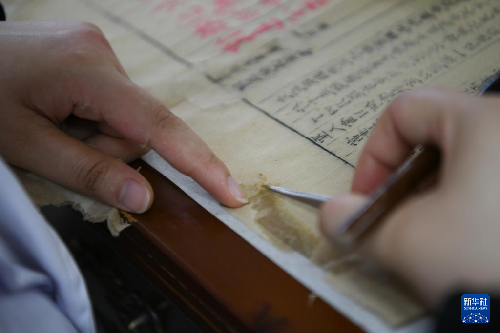 在四川西部文献修复中心,唐陈韵将纸张破损处经修复后多余的部分揭除(4月19日摄)。