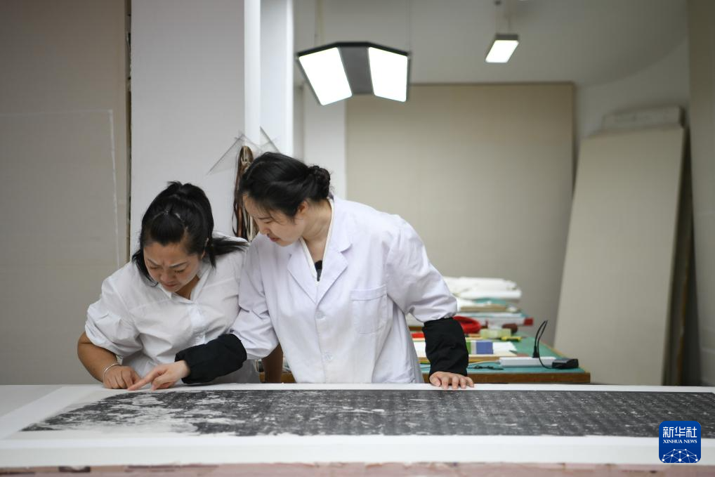 唐陈韵(右)与同事交流近期完成的一件拓片修复情况(4月19日摄)。