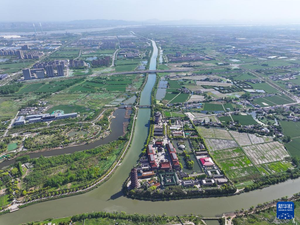 位于扬州邗江区瓜洲镇的高旻寺和大运河风光(无人机照片,4月24日摄)。