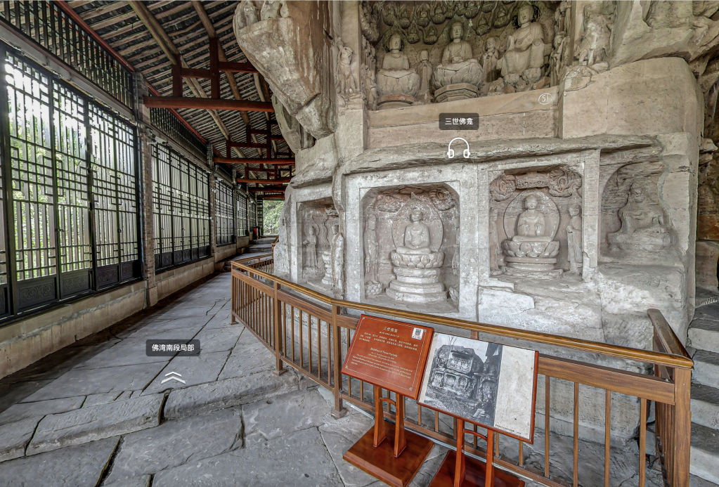 大足石刻数字博物馆中的三世佛龛实景图。(大足石刻数字博物馆官网截图)