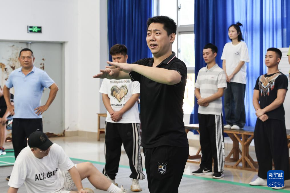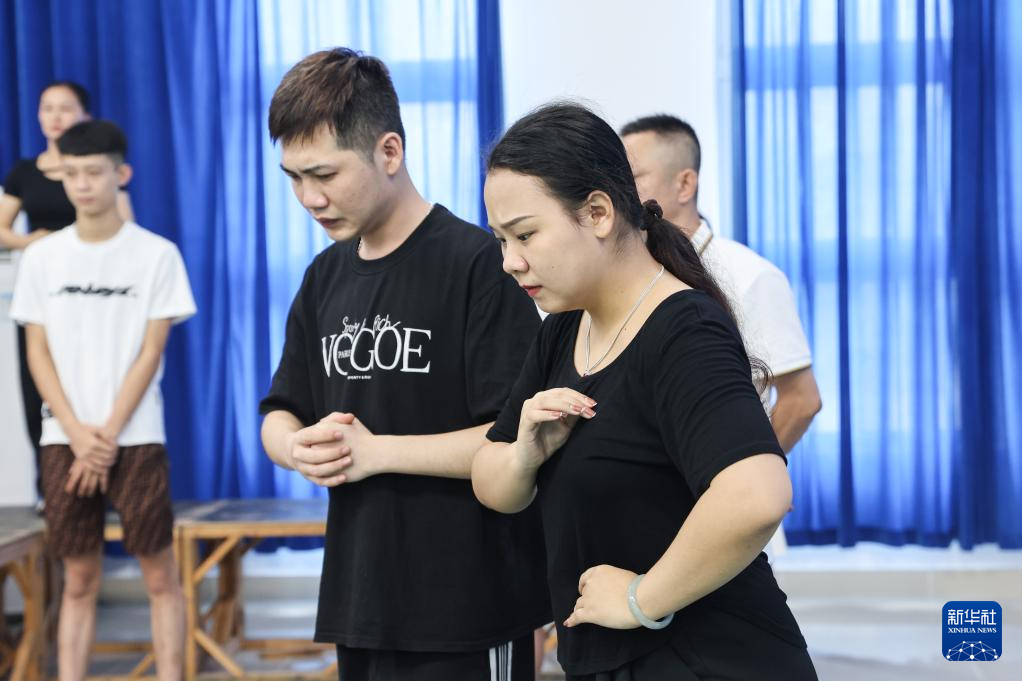 4月24日,陈科翰(右)在海南省定安县文化馆和同事们排练琼剧。
