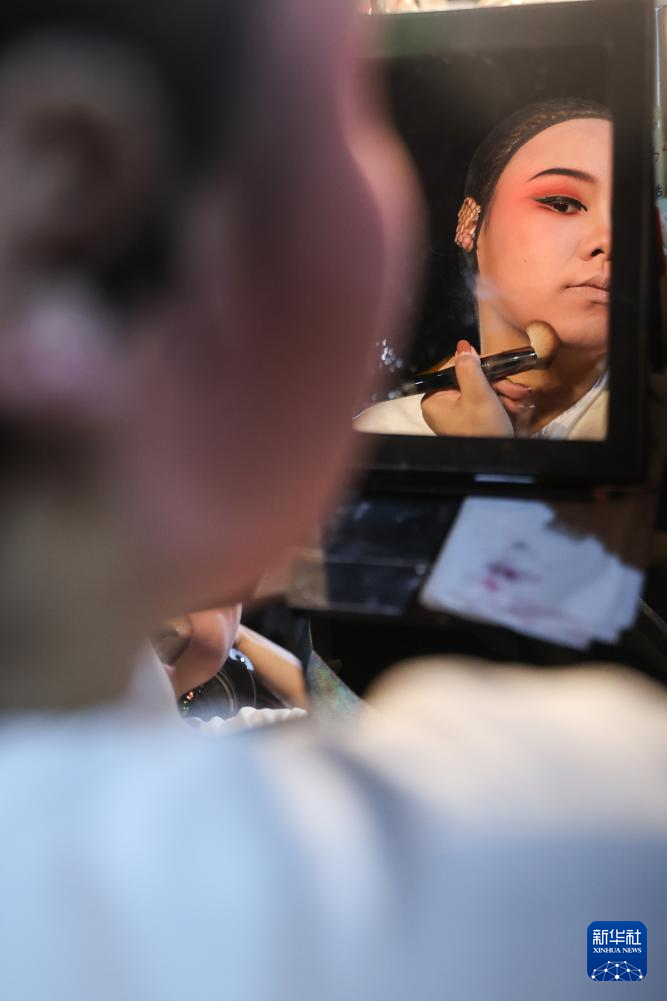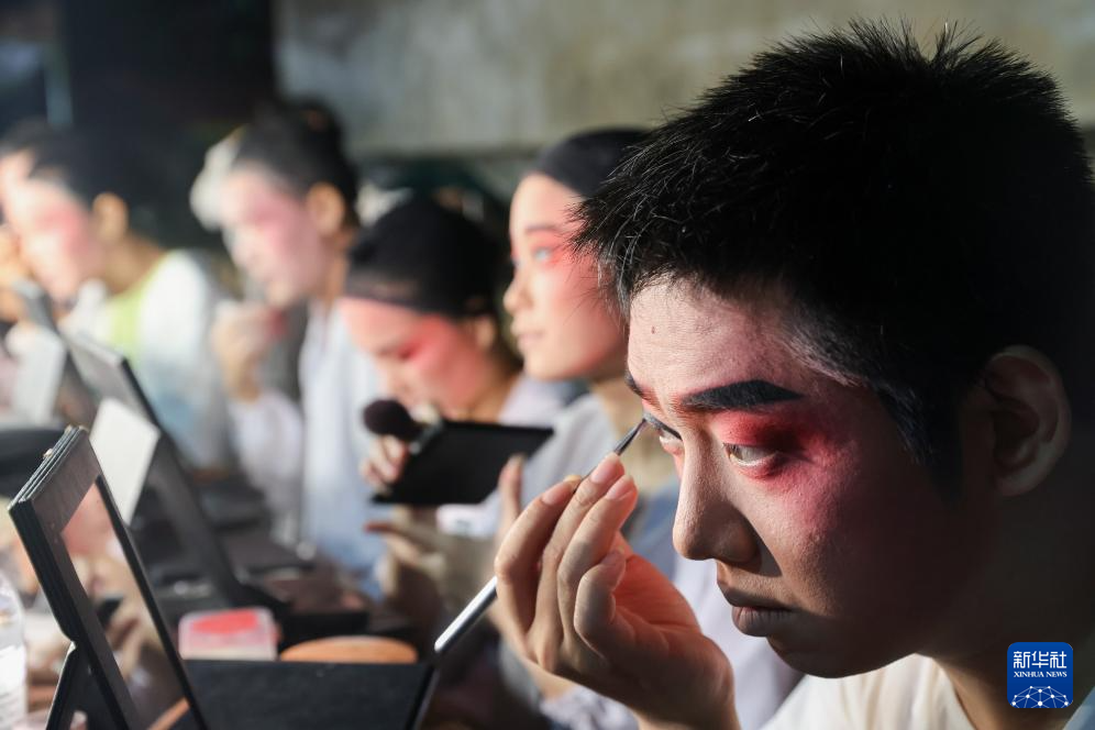 5月2日,在海南省海口市岭梅村,陈科翰(右一)在演出前化妆。