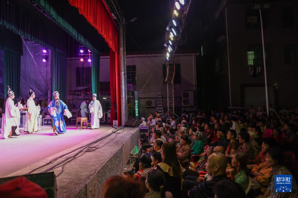 2月21日,海南省定安县后山村的村民在村口观看琼剧。