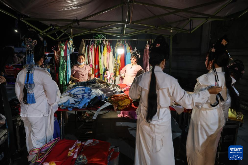 4月23日,在海南省定安县文笔峰景区,定安县琼剧团的演员在舞台后换戏服。