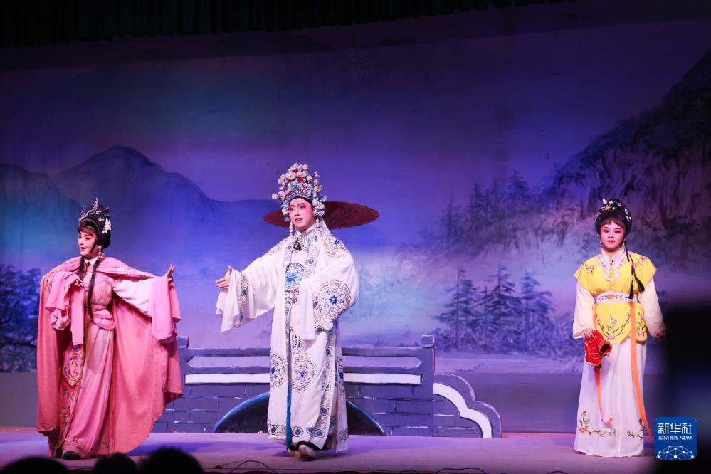 4月23日,在海南省定安县文笔峰景区,林芳(右一)和陈科翰(右二)在舞台上表演琼剧。