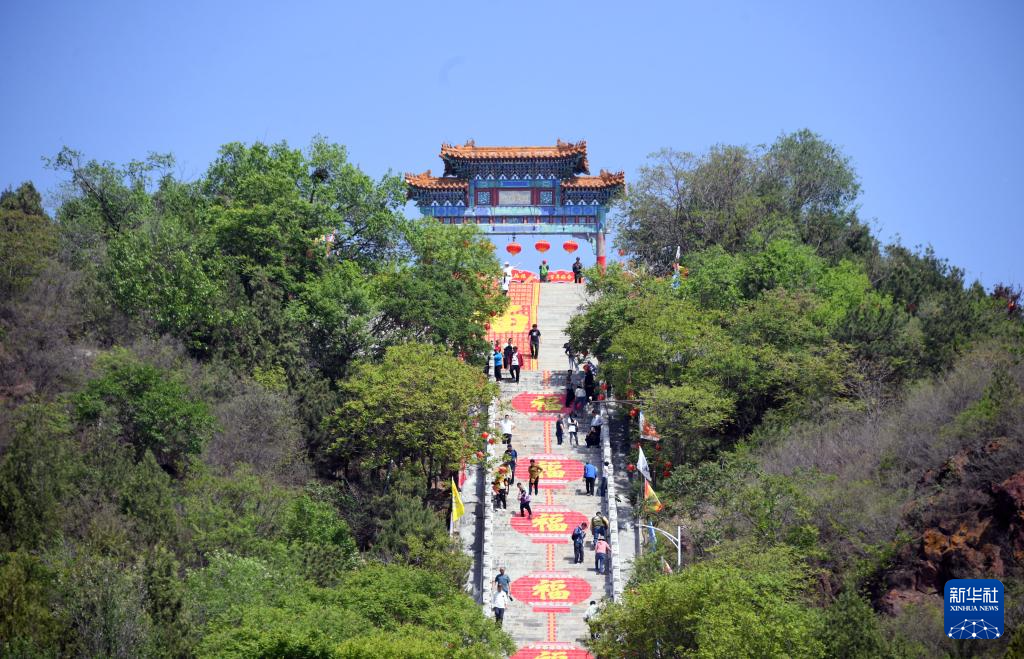 5月8日,游人在位于北京市平谷区刘家店镇的丫髻山登山。