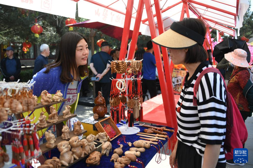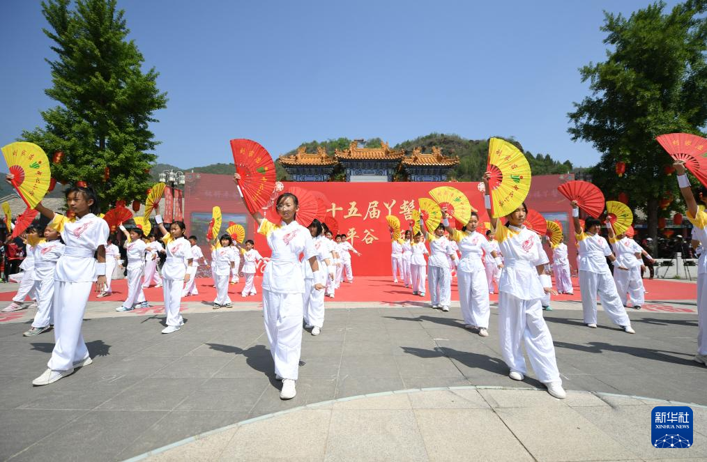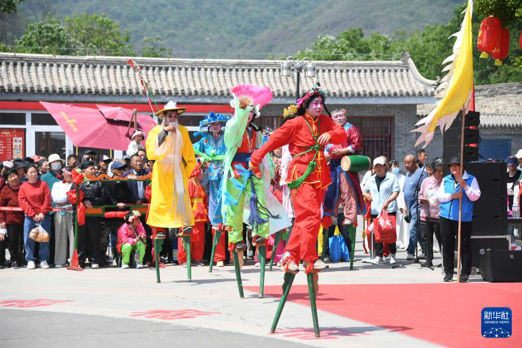 5月8日,来自北京市平谷区刘家店镇的村民在庙会开幕式现场表演节目。