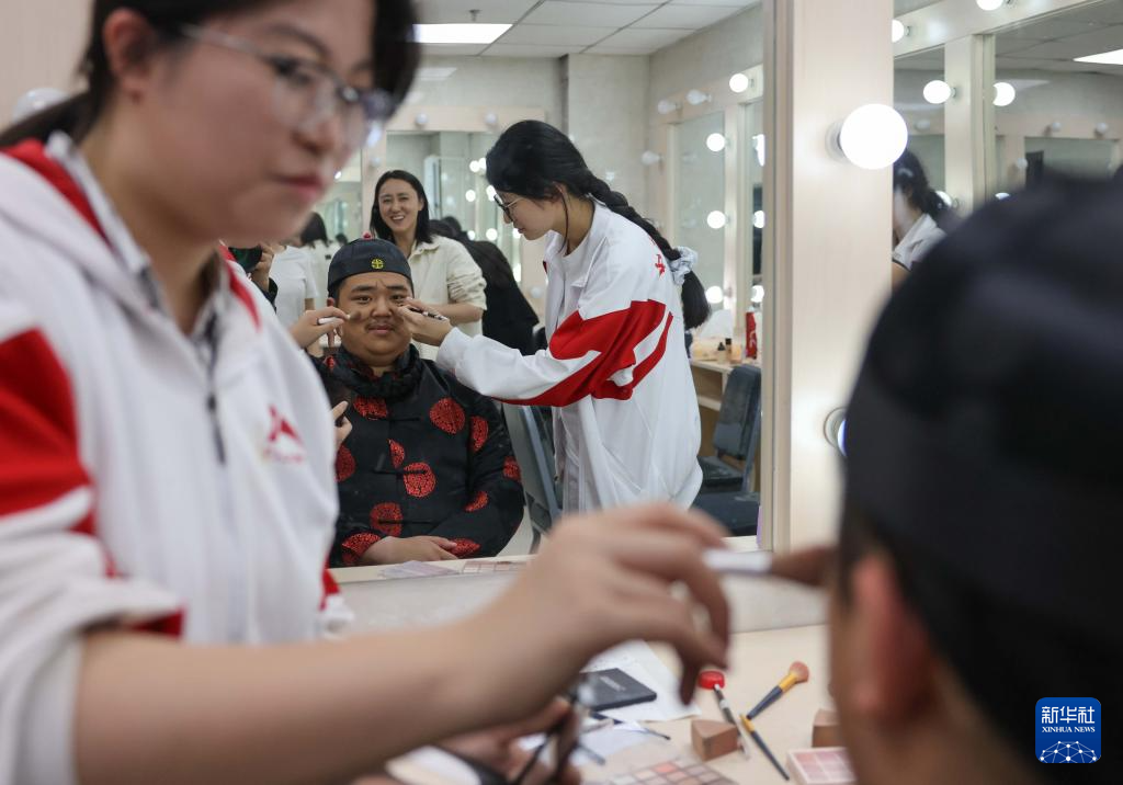 5月11日,中国人民大学附属中学分校的学生在演出前化妆。