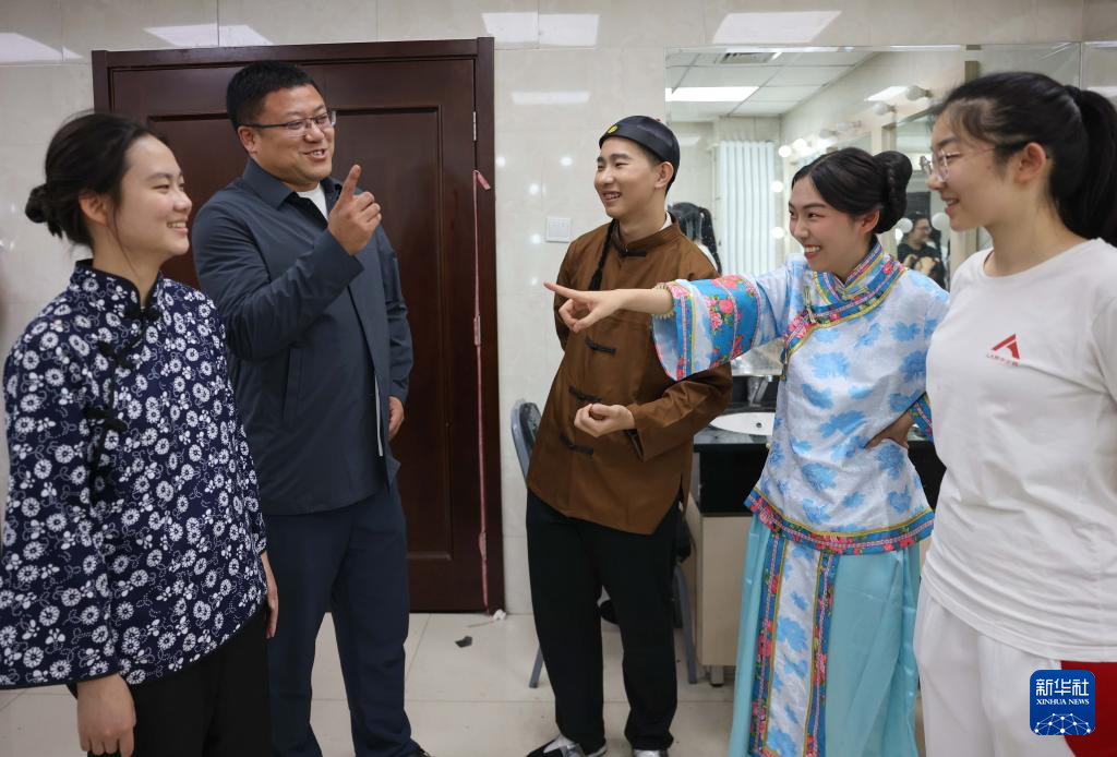 5月11日,中国人民大学附属中学分校副校长王尧(左二)与学生交流戏剧舞台动作。