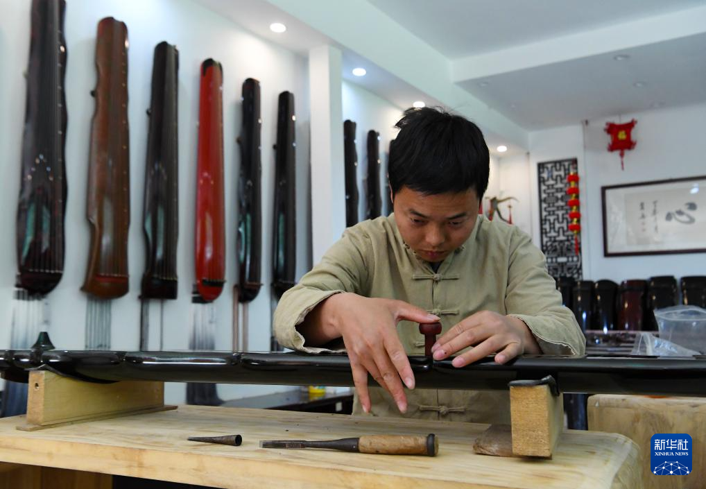 5月13日,河南省兰考县堌阳镇的斫琴师徐冰在家中弹奏古琴。