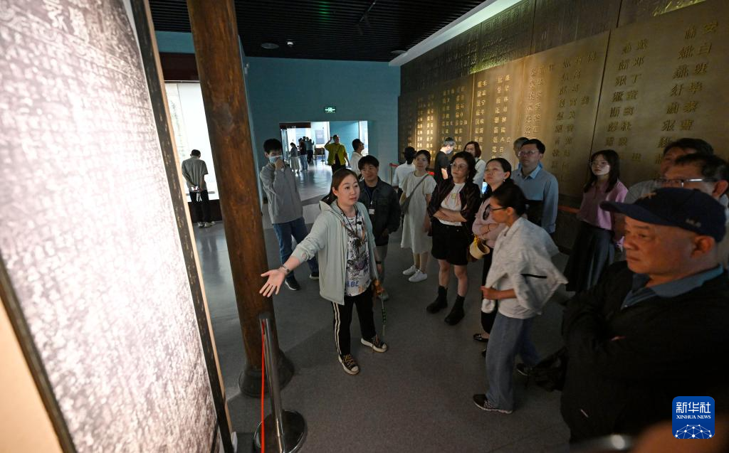 义务讲解员在宁夏博物馆为游客讲述文物故事(5月14日摄)。