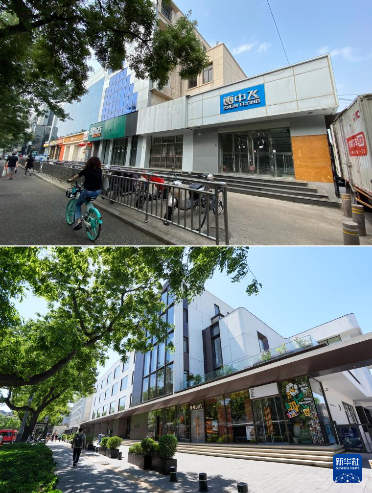 上图为位于东四南大街的原三友商场(资料照片);下图为2024年5月11日拍摄的由原三友商场改造而来的雪莲·亮点文创园外景。雪莲·亮点文创园已成为时尚生活打卡地和文化产业集合地(新华社记者鞠焕宗摄)。